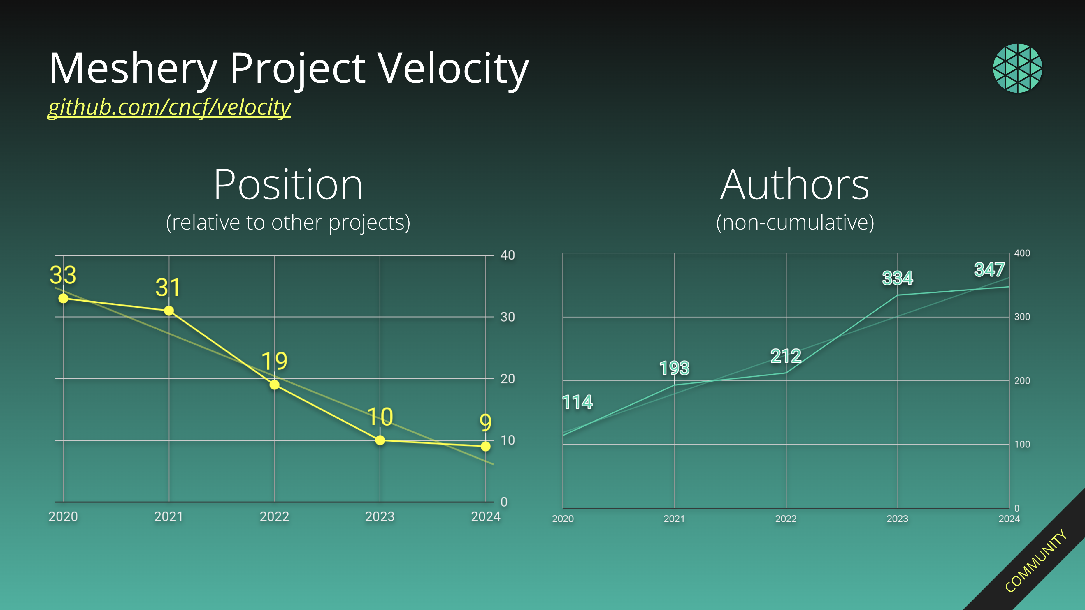 It’s truly impressive that Meshery, still in its Sandbox stage, has achieved such a high velocity ranking. This accomplishment underscores the project’s robust community, active development, and the immense value it brings to the cloud-native ecosystem. Meshery’s journey has been one of consistent growth and acceleration. As seen in the “Meshery Project Velocity” slide from the Meshery Incubation Proposal, its position relative to other projects has steadily climbed: